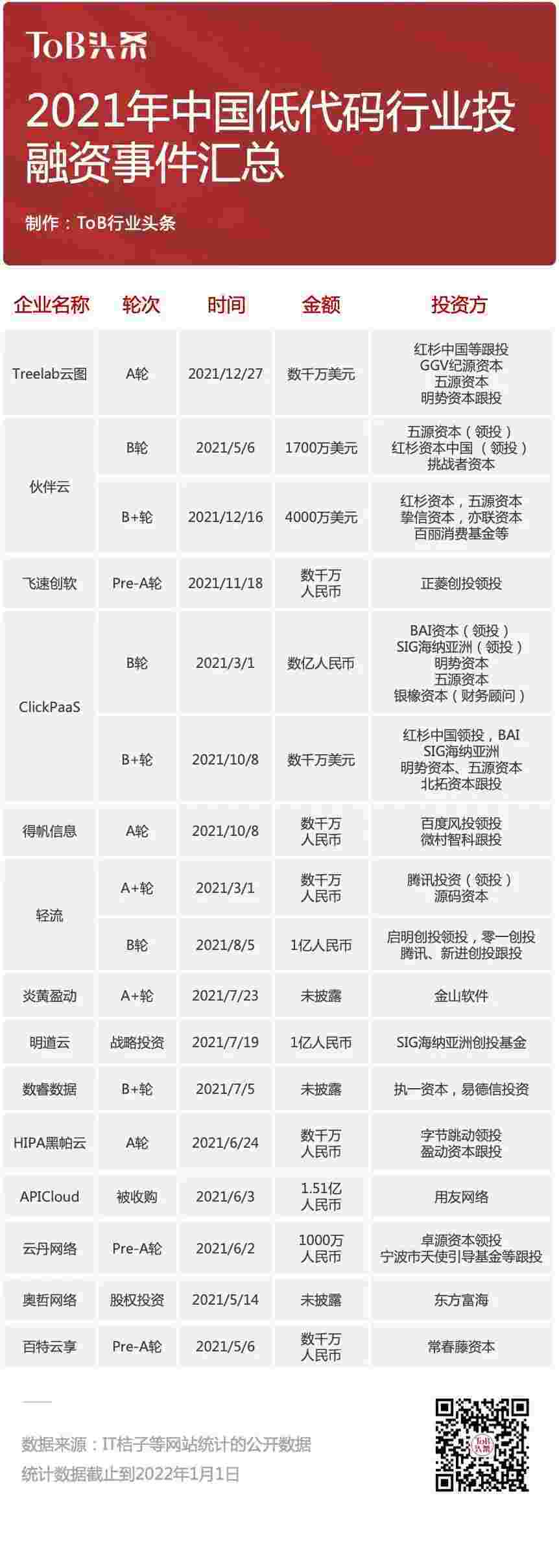 到2021年,,无/低代码投融资规模势头更甚,,,,其中包括轻流两轮融资(A+轮数千万人民币,,B轮近亿人民币)、、、、CGPAY钱包 两轮融资(B轮数亿人民币,,,,B+轮数千万美元)、、、、百特云享数千万元Pre-A轮融资......